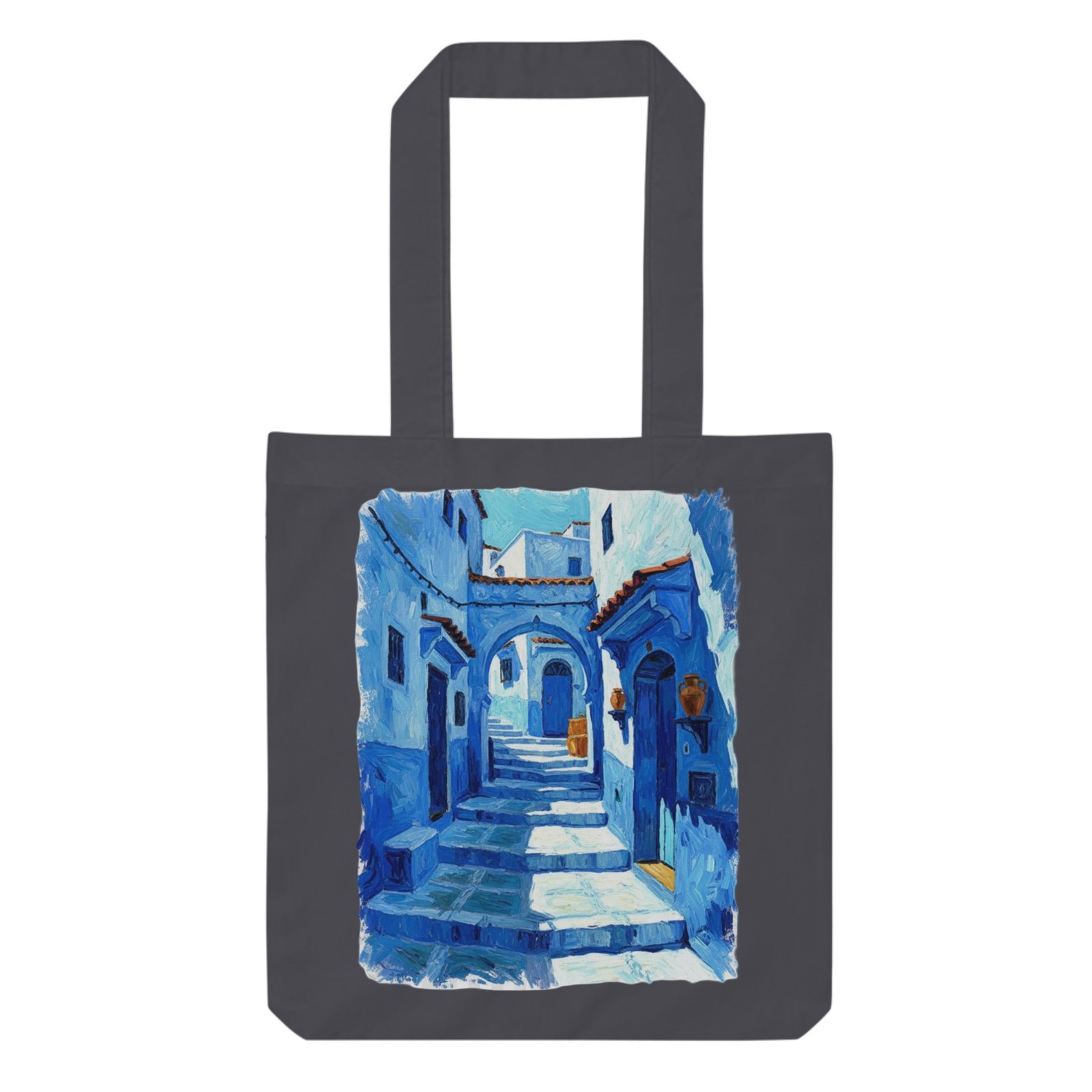 Carry art and culture wherever you go with this cotton canvas tote bag featuring a painterly blue medina alley. Inspired by Chefchaouen’s iconic streets, it blends Moroccan charm with everyday practicality—perfect for shopping, travel, or daily essentials in style.
