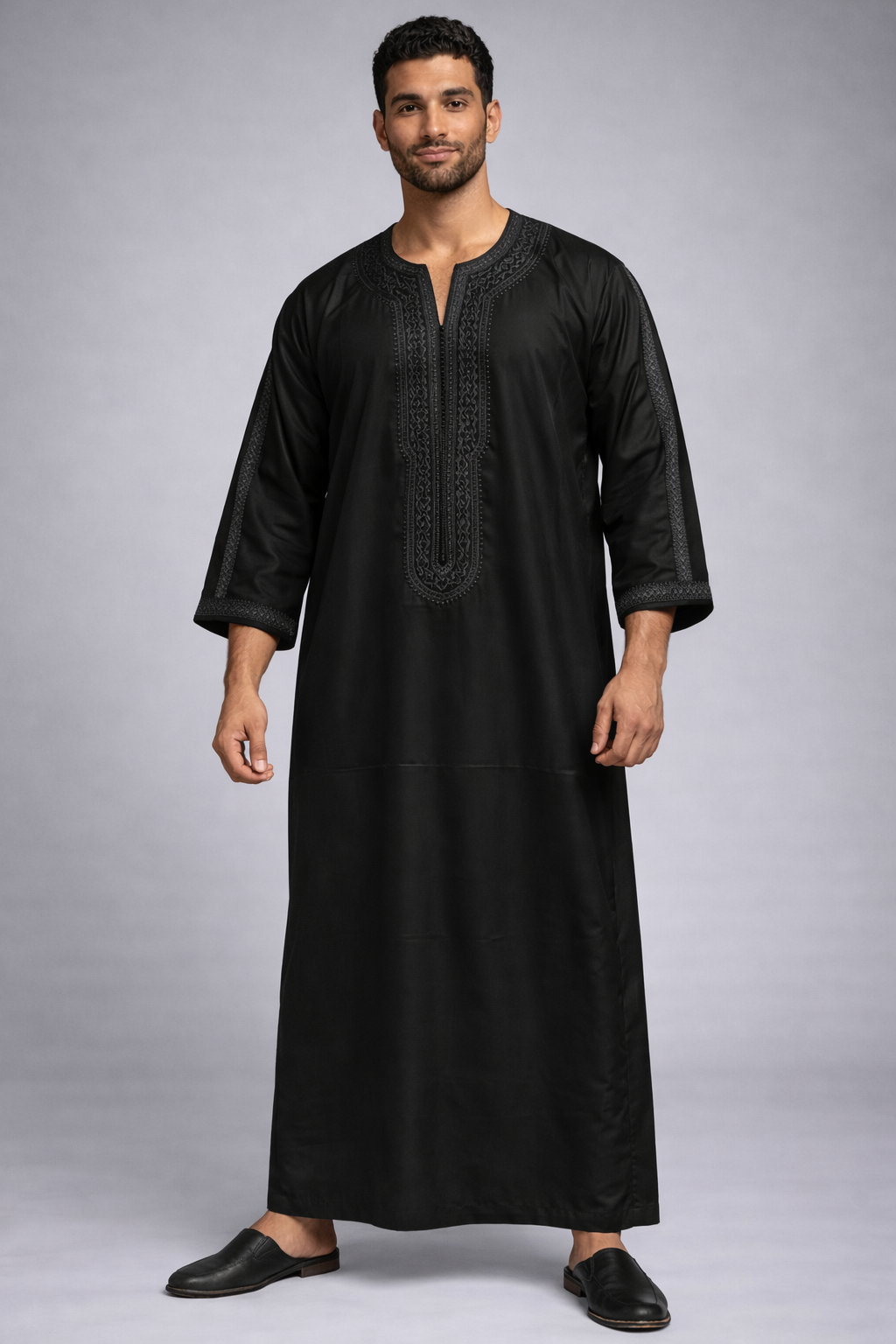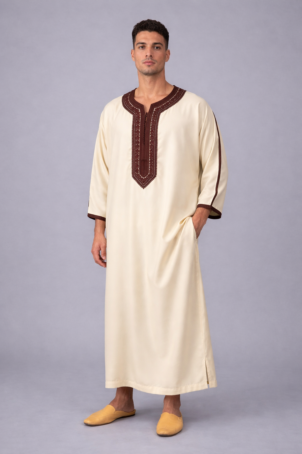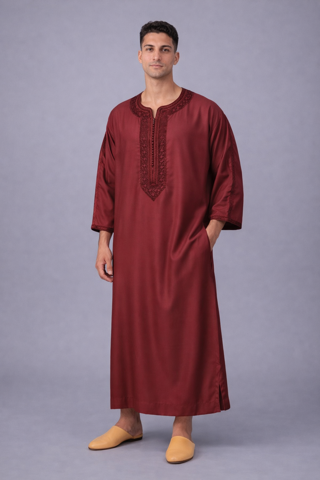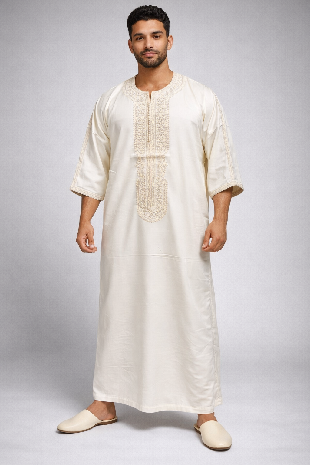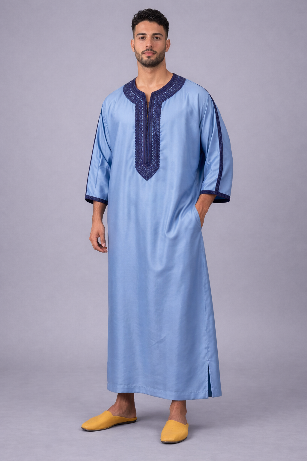 كندورة مغربية أنيقة بتصميم تقليدي عصري، مصنوعة من قماش خفيف ومريح. كتتميز بالتطريز الراقي فالصدر والياقة مع قصة واسعة كتعطي راحة وأناقة فلبسها. مناسبة للخروج، المناسبات أو اللبس اليومي بأسلوب مغربي أصيل.