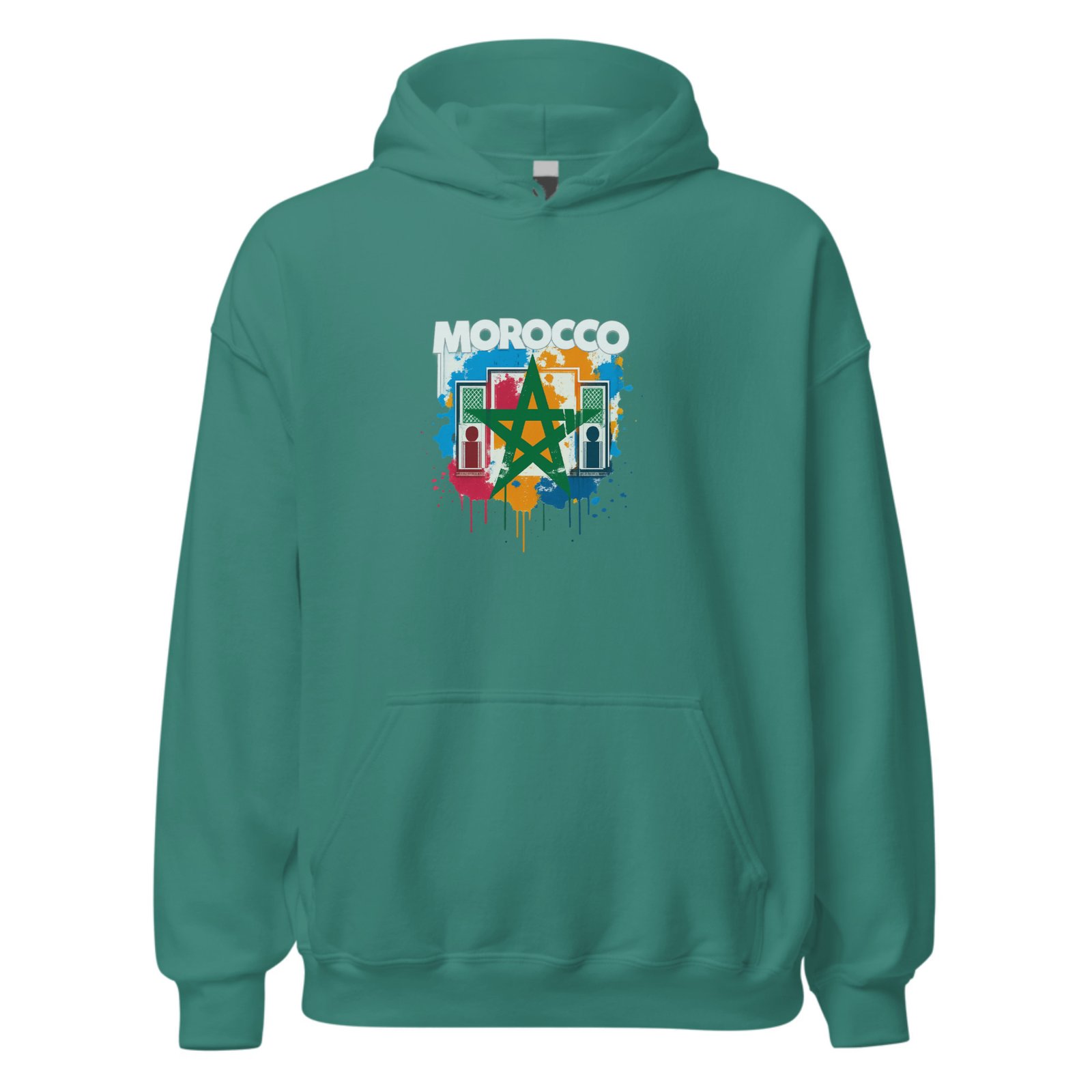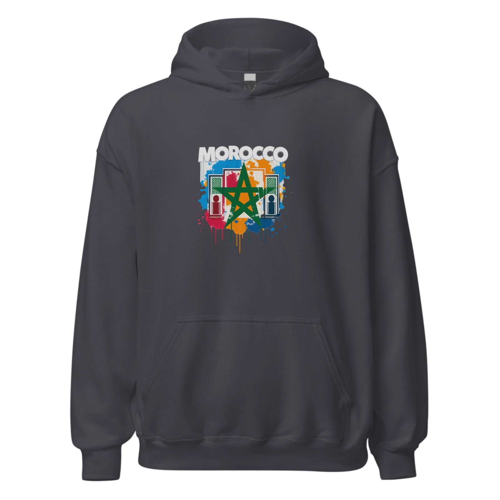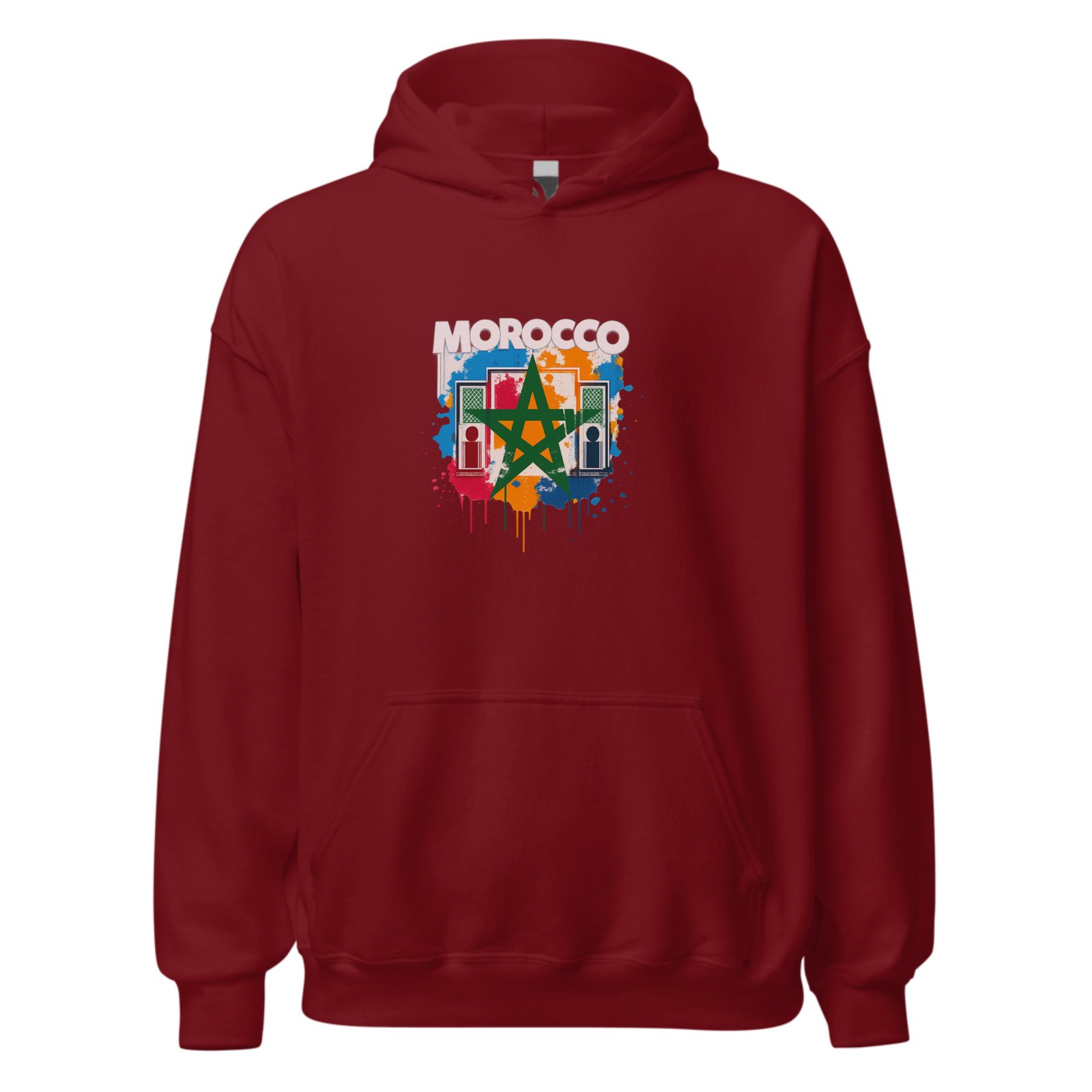 Affiche fièrement l’esprit du Maroc avec ce hoodie unique au style street art moderne. Le design met en valeur l’étoile marocaine emblématique, entourée de portes traditionnelles et d’éclaboussures de couleurs vibrantes, symbole de culture, d’histoire et de créativité.