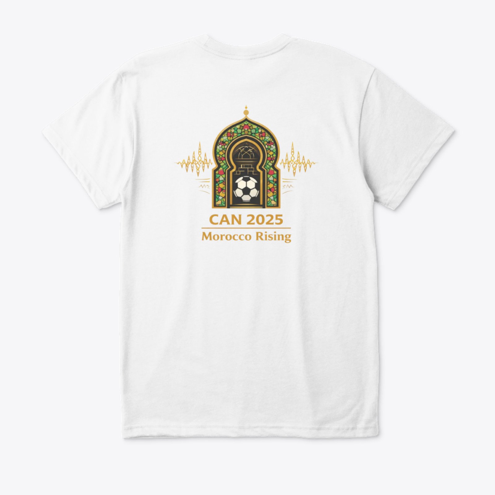 T-shirt inspired by CAN 2025. Features “The Fans’ Voice Creates Glory” on the front and a Moroccan-inspired arch design with “CAN 2025 – Morocco Rising” on the back. Comfortable, stylish, and perfect for true football fans.