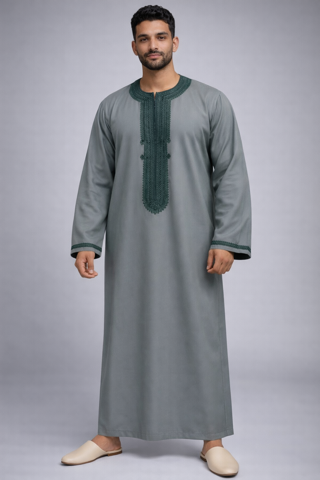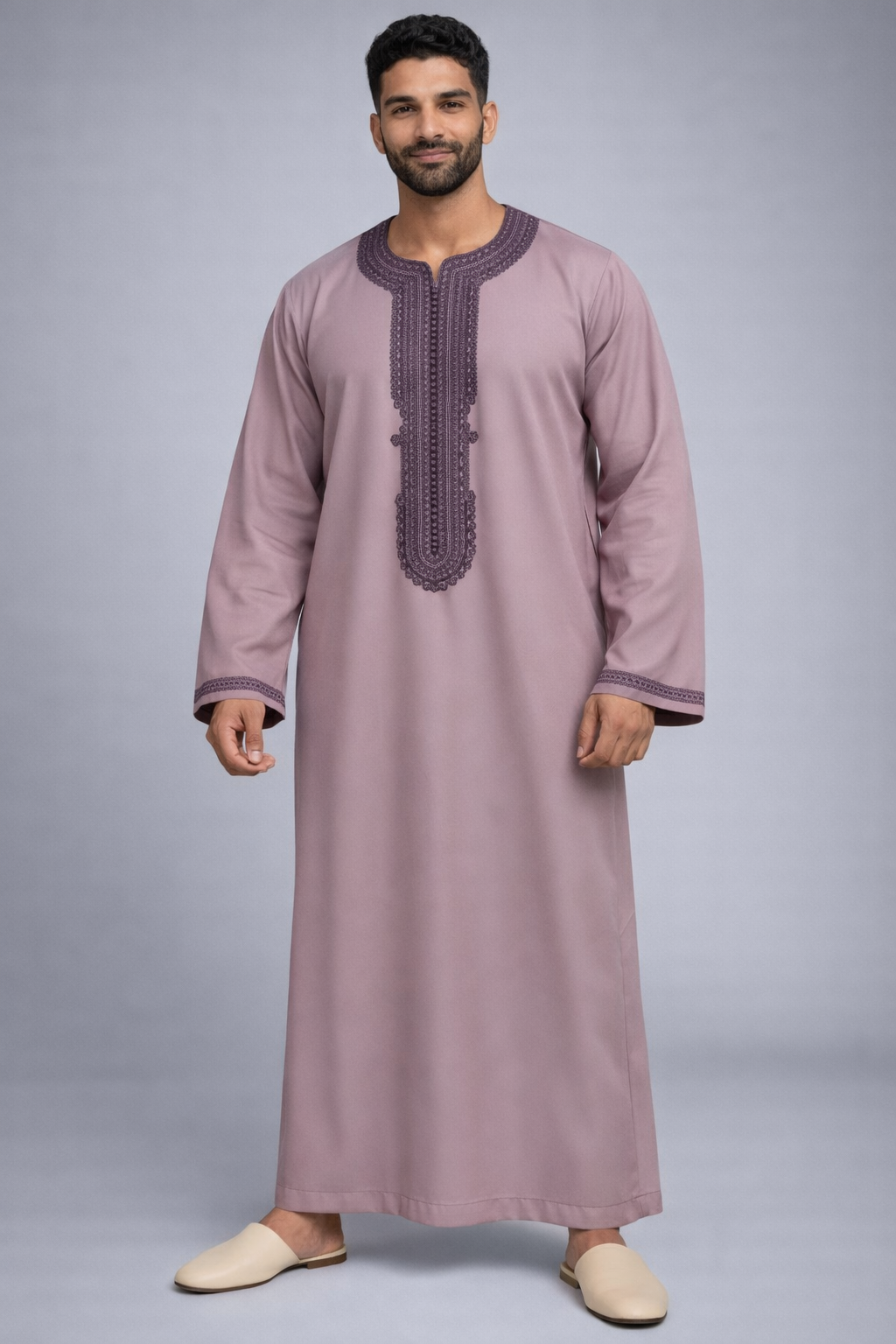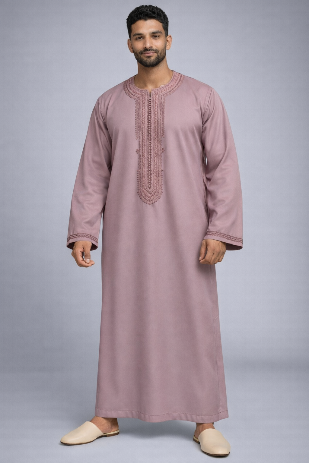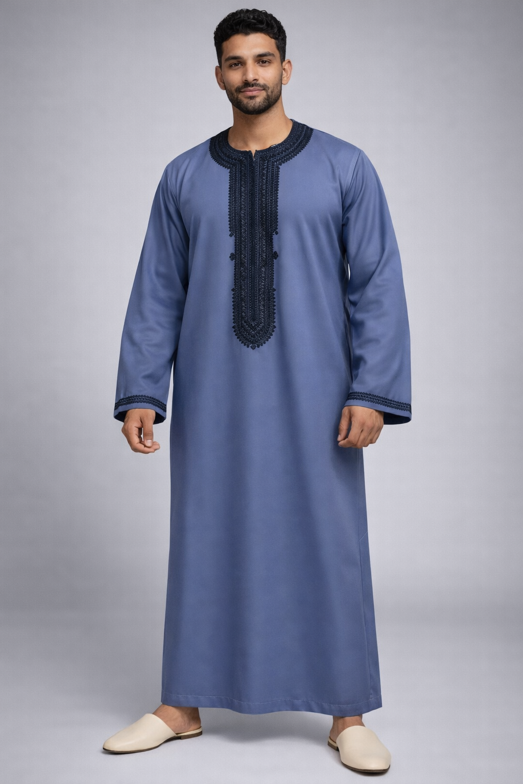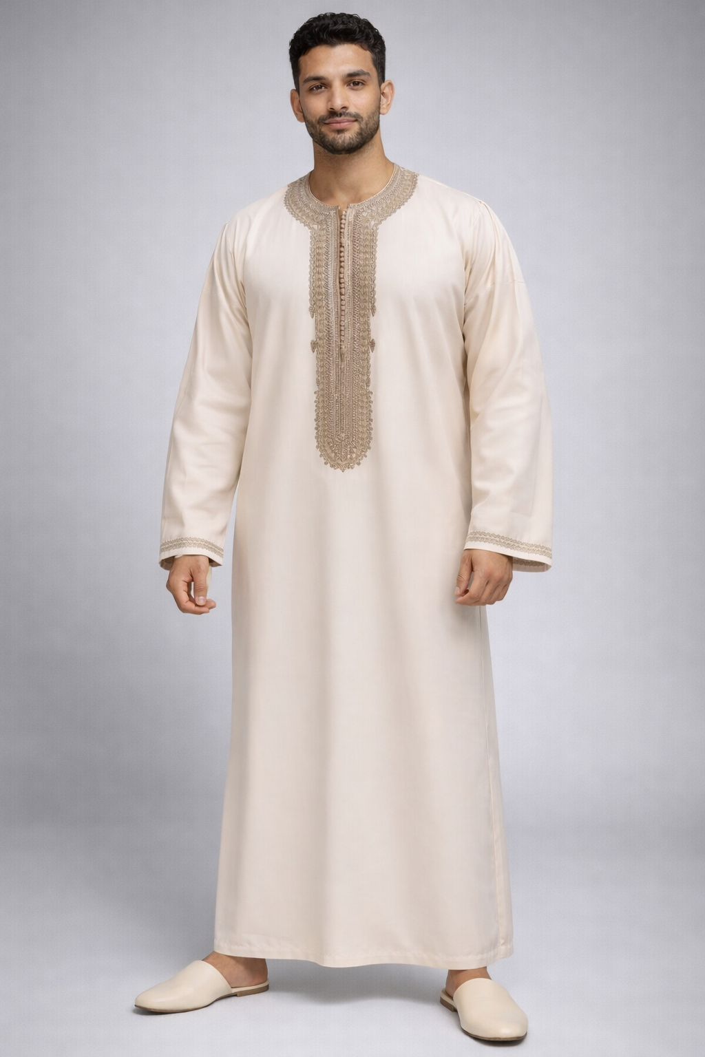 Qmiss beldi marocain au style traditionnel et élégant. Confectionné dans un tissu léger et confortable, il se distingue par sa broderie raffinée au niveau du col et de la poitrine, apportant une touche authentique. Idéal pour les occasions, la prière ou un look traditionnel au quotidien.